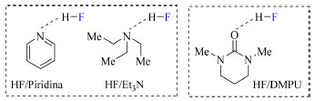 ![]() Figura 12. Interações do tipo ligação de hidrogênio intermolecular entre HF e piridina, Et3N e DMPU (fonte: adaptado de Liang e colaboradores)1
