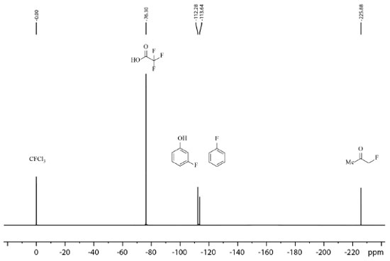 ![]() Figura 13. Espectro de 19F de amostra contendo uma mistura de triclorofluorometano, ácido trifluoroacético, 3-fluorofenol, fluorobenzeno e fluoroacetona obtido em equipamento Bruker Avance III a 235 MHz (19F) em CDCl3