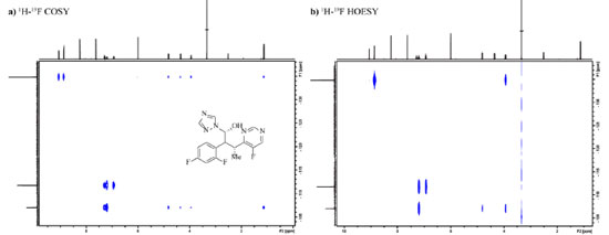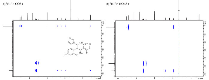 ![]() Figura 14. Mapas de contorno dos experimentos 1H-19F COSY (a) e 1H-19F HOESY (b) do fármaco voriconazol em DMSO-d6 obtidos em equipamento Bruker Avance III a 600 MHz (1H)