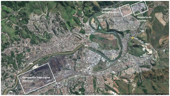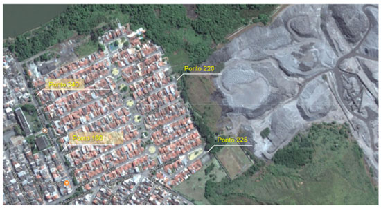 PARTE EXPERIMENTAL População e área de estudo A população estudada foi constituída por 211 moradores de um condomínio residencial construído sobre um antigo depósito de rejeitos industriais, já desativado, próximo à planta industrial de produção de aço e ferro e vizinha a um depósito de resíduos siderúrgicos ainda ativo. As campanhas de coleta ambiental foram iniciadas em 2016 e se sucederam até o ano de 2018, em 4 pontos fixos de coleta (entrada das ruas 180 e 340 e final das ruas 220 e 225). Uma vez que a chuva pode impactar na diminuição dos níveis dos contaminantes no ar devido a incorporação do material particulado (MP) à chuva,33 ficou estabelecido um critério para a coleta respeitando-se um intervalo mínimo sem precipitações de 3 dias anteriores a data da coleta. A coleta de amostras biológicas ocorreu nos anos de 2017 e 2018, totalizando 211 amostras de urina. A Figura 1 mostra a localização do condomínio e suas possíveis fontes de emissão.