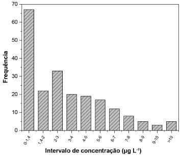 ![]() Figura 3. Frequência de resultados de níquel em urina (μg L-1) dos moradores do condomínio Volta Grande IV
