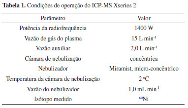 A metodologia de coleta seguiu as normas estabelecidas pela Agência de Proteção Ambiental dos Estados Unidos (US EPA, United States Environmental Protection Agency) para amostragem de ar atmosférico em ambientes externos, com fonte de emissão estacionária.34 Para tal, empregou-se uma vazão de 500 L min-1 e filtros de fibra de vidro da marca Sibata, com 110 mm de diâmetro e tamanho de poro de 0,8 μm, sem resina ligante. A bomba foi posicionada a uma altura de 2 m e o período total de coleta foi de 4 h. A extração do Ni presente no material particulado que ficou retido nos filtros foi realizada seguindo o método US EPA (IO 3.1),35 cortando-se o mesmo em pequenos pedaços e adicionando 3 mL de HNO3 concentrado e 27 mL de água ultrapura (tipo I), seguido de aquecimento a 65 °C por 2 h. O extrato obtido foi filtrado e volume final foi completado para 50 mL com água ultrapura. O mesmo procedimento foi realizado para os brancos de análise e de campo. Para cada dia de coleta foram empregados dois brancos de campo e dois de análise. Devido à indisponibilidade de uma amostra certificada adequada, a exatidão do método foi avaliada tanto pela análise do material de referência certificado EP-H3 Drinking Water (EnviroMAT, SCP Science) como através da realização de ensaios de recuperação nos filtros utilizados. As recuperações obtidas foram de 95,9 ± 5% para a amostra certificada e de 98 ± 7% para as amostras fortificadas. Os limites de detecção e quantificação do método foram de 0,06 e 0,20 ng m-3, respectivamente. A quantificação foi realizada por ICP MS e utilizou as condições mostradas na Tabela 1.