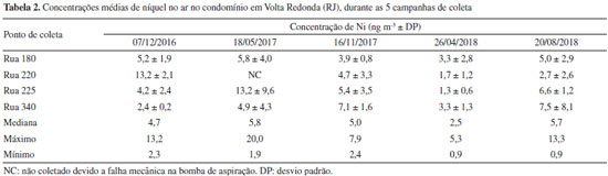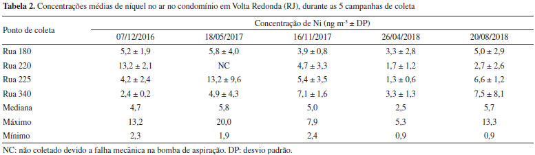 RESULTADOS E DISCUSSÃO Determinação de níquel no ar atmosférico As concentrações médias de Ni no ar, nos pontos e datas de coleta e avaliados, estão apresentadas na Tabela 2 e são reportados em ng m-3. Convém destacar que no ponto de coleta da Rua 220 não foi possível coletar amostras do ar na campanha de 18/05/2017, uma vez que ocorreu uma falha mecânica na bomba de aspiração durante o período de coleta (nos dois turnos). Cabe ainda salientar que o ponto de coleta da Rua 340 apresentou dois valores extremamente elevados, que foram descartados estatisticamente (p < 0.05). Tais observações foram desconsideradas na análise dos dados.