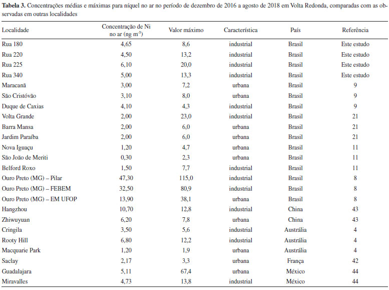 As concentrações médias de Ni no ar atmosférico variaram de 1,3 a 13,2 ng m-3, quando consideramos o conjunto total de dados obtidos, nos diferentes pontos e diferentes dias de coleta. Esses valores são compatíveis com os níveis reportados em áreas urbanas, que podem estar entre 5 e 35 ng m-3,37 como já observado em outros trabalhos. No Brasil, a normas legais não estabelecem um valor limite para a concentração de Ni no ar e, por essa razão, não foi possível realizar qualquer inferência a respeito dos níveis observados neste estudo.13 Em outros países, não existe um consenso a respeito desses limites. A Comunidade Europeia, assim como o Canadá, estabelece um "valor alvo" de 20 ng m-3 para Ni no ar, que tem como objetivo alcançar um compromisso entre a proteção à saúde e evitar custos excessivos para a indútria.15 Assim, pode-se dizer que esta concentração não está baseada diretamente no impacto do metal na saúde da população. Nos Estados Unidos, a Agência de Proteção Ambiental (US EPA) não estabelece um valor limite para Ni no ar. Contudo, o estado da Califórnia tem adotado o valor máximo de 200 ng m-3 para 1 h de exposição e de 60 ng m-3 para 8 h.38 Já na Austrália, é adotada a concentração de 3 ng m-3 para uma média anual de Ni no ar em material particulado até 10 μm (MP10). Este valor leva em consideração os efeitos nocivos do metal à saúde humana. Entretanto, sua aplicação não é obrigatória, sendo considerado apenas de caráter orientativo e dependente das atividades desenvolvidas na região, podendo ser aumentado devido as circunstâncias locais.15,39 Segundo a instituição CAREX40 (Carcinogen Exposure), do Canadá, uma pessoa que respire poeiras metálicas contendo concentrações de Ni da ordem de 5,4 ng m-3, durante a sua vida, possui uma chance em um milhão de desenvolver câncer como resultado direto dessa exposição.40,41 Uma análise de variância de dois fatores (data de coleta e localidade) foi realizada com os dados obtidos e ficou demonstrado, estatisticamente (95% de confiança), que não houve influência de quaisquer dos fatores testados sobre a concentração de Ni no ar. Com isso, pode-se concluir que o Condomínio Volta Grande IV apresentou uma atmosfera homogênea e sem grandes flutuações da concentração de Ni ao longo do período desse estudo. Adicionalmente, esses resultados indicaram que a posição dos pontos de coleta em relação a montanha de rejeitos parece não ter impacto permanente sobre as concentrações de Ni no ar. As concentrações mais altas de Ni no ar foram verificadas na Rua 220 (07/12/2016) e na Rua 225 (18/05/2017) que são os pontos de coleta mais próximos à montanha de rejeitos. Essas concentrações podem ser resultado de eventos pontuais ocorridos nas datas de coleta, uma vez a análise estatística dos dados evidenciou não haver influência da montanha de rejeitos sobre as concentrações de Ni no ar, como mencionado anteriormente. É importante destacar também que as concentrações de Ni no ar observadas no dia 26/04/2018 foram sistematicamente menores do que aquelas observadas em outras datas, em todos os pontos de coleta. Novamente, essa observação pode ser creditada a algum evento esporádico, uma vez que a análise estatística tampouco apontou diferença entre as concentrações de Ni no ar em relação às datas de coleta. Ao comparar os dados obtidos nesse estudo com dados obtidos em outros trabalhos (Tabela 3), foi possível verificar que em um estudo anterior,21 realizado em 2006, na mesma região, foram observadas concentrações de Ni no ar atmosférico semelhantes às do presente trabalho, em termos de média e valores máximos, comprovando que a contaminação no local é contínua e de mesma intensidade ao longo do tempo. Quando os resultados obtidos são confrontados com os dados disponíveis em outros estudos para outras cidades do Rio de Janeiro, observa-se que as concentrações medidas são mais elevadas do que aquelas observadas em cidades de mesmas características, como Belford Roxo11 e Duque de Caxias,9 que apresentam fortes características urbanas e intensa atividade industrial. O município de Belford Roxo apresenta marcante concentração de indústrias químicas, enquanto Duque de Caxias apresenta um variado portfólio industrial, ainda que sob forte influência da Reduc/Petrobras (refinaria de petróleo).