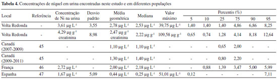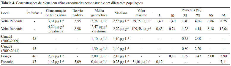 Tomando como parâmetro as concentrações de Ni consideradas como referência pela OMS, ou seja, entre 1 e 2 μg L-1, foi verificado que 144 amostras (68% do total) apresentaram concentrações superiores a valor máximo do intervalo, indicando que pode estar havendo uma excessiva exposição da população local a esse metal, possivelmente como resultado das atividades siderúrgicas locais. Ao comparar o presente estudo a outros estudos relacionados ao biomonitoramento de populações não expostas, os valores observados de níquel em urina neste grupo são mais elevados, confirmando que, em alguma medida, os moradores do local foram expostos a concentrações de Ni maiores do que as que ocorrem naturalmente. Um estudo realizado no Canadá45 avaliou, em duas campanhas, a concentração de níquel na urina de um grupo de 6000 indivíduos, com faixa de idade entre 3 e 79 anos. Foram observadas concentrações médias de Ni na urina dos participantes de 1,1 e 1,3 μg L-1, nas campanhas de 2007/2009 e 2009/2011 respectivamente. Esses valores foram inferiores à média geométrica dos resultados observados no presente estudo, que foi de 2,78 μg L-1. Por sua vez, quando os resultados são avaliados em termos de percentis, novamente as concentrações observadas em Volta Redonda mostraram que os moradores apresentaram concentrações mais elevadas de Ni na urina do que as observadas no estudo canadense, cujos níveis para os percentis 25 e 75% foram de 0,65/0,80 μg L-1 (2007 2009/2000 2011) e 2,0/2,2 μg L-1, respectivamente, enquanto que em Volta Redonda esses valores foram menores que o limite de detecção (1,4 μg L-1) e 4,86 μg L-1 respectivamente. Em um estudo realizado na França,46 efetuado com vistas ao biomonitoramento de uma população adulta com cerca de 2000 pessoas, a média geométrica da concentração de Ni na urina foi de 2,00 μg L-1 (1,93 a 2,08, 95% intervalo de confiança). Os percentis 10 e 90% observados foram de 0,88 e 5,00 μg L-1, respectivamente, enquanto quem em Volta Redonda os valores encontrados para esses mesmos percentis foram menores do que o limite de detecção (1,4 μg L-1) e 6,86 μg L-1, respectivamente. Mudando o parâmetro de comparação, e tendo o estudo realizado na Espanha47 com 178 indivíduos expostos ocupacionalmente em indústrias siderúrgicas como referência, pôde-se verificar que os níveis de Ni na urina do grupo de estudo (Volta Redonda) são comparáveis aos observados nesse estudo. É importante destacar que, neste estudo, a creatinina foi utilizada como fator de correção de possíveis variações individuais e, assim, os valores foram reportados em termos de μg de Ni g-1 de creatinina. A média obtida no estudo espanhol foi de 1,7 μg g-1 de creatinina, com os valores variando de 0,1 a 51,1 μg g-1 de creatinina, enquanto no presente estudo este valor foi de 4,29 μg g-1 de creatinina, com amplitude de 0,65 a 31,96 μg g-1. Analisando ainda os percentis deste estudo, foram verificadas diferenças importantes nas concentrações de Ni na urina. Os valores compreendidos entre os percentis 5 e 95% foram de 0,12 a 7,11 μg g-1 de creatinina, enquanto que em Volta Redonda esses níveis variaram de 0,65 a 12,64 μg g-1 de creatinina, sugerindo uma exposição ainda maior dos moradores do Condomínio Volta Grande IV do que a ocupacional. A Tabela 4 traz a comparação dos resultados do presente estudo com outros trabalhos publicados.