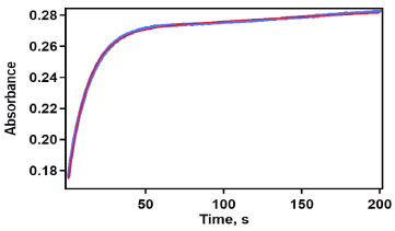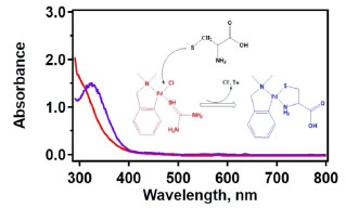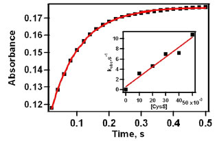 Kinetics studies The reaction between the complex [PdCl(C2N-dmba)(tu)] and L-cysteine was monitored by a change of the electronic spectra using stopped-flow and conventional techniques. After mixing the reagents, an increase in the absorbance at 330 nm occurred until it reached a plateau after a few seconds (Figure 4).