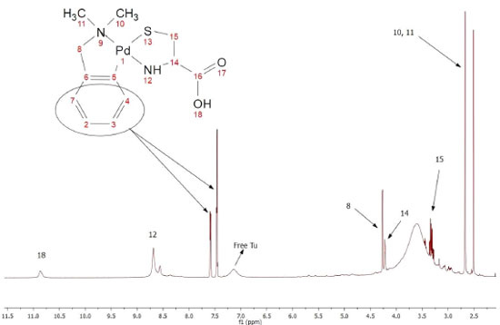 The NMR data strongly suggest an interaction between the palladium complex and L-cysteine. The 1H NMR spectrum of the complex [PdCl(C2,N-dmba)(tu)] in DMSO presents signals between 6.7 and 7.3 ppm attributed to the aromatic hydrogens of the ligand dmba, which disappears concomitant with the appearance of signals at 7.59 and 7.46 ppm after the mixture of the reagents. The vinyl proton signal changes from 3.93 to 4.25 ppm, and a singlet of the methyl groups (2.66 ppm) was observed to displace to 2.70 ppm after the addition of L-cysteine. The signals at 8.52 ppm disappear concomitant with the appearance of one signal at 7.12 ppm, indicating the release of thiourea from the coordination sphere substituted by L-cysteine (Figure 2 and Figure 1S).