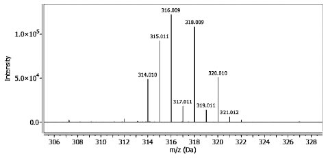 ![]() Figure 3. Mass spectrum of the reaction between [PdCl(C2,N-dmba)(tu)] and L-cysteine. Positive mode (source: elaborated by the authors)