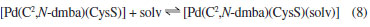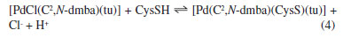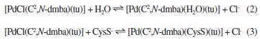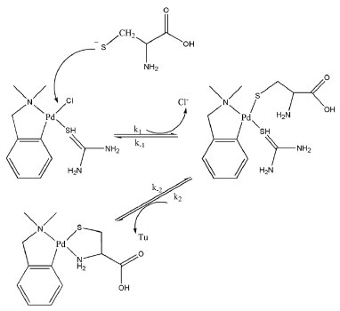 | Kinetic study of the reaction between the cyclopalladated complex [PdCl(C2,N-dmba)(tu)] (dmba = N,N-dimethylbenzylamine, tu = thiourea) and L-cysteine |