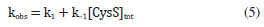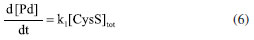 ![]() Since pH of the solution of the reaction is 7.4 and pKa of the L-cysteine at 25 °C is 8.3 we can assume that [CysS]tot = [CysS-] + [CysSH], which the kinetic expression can be written below (Equation 5):