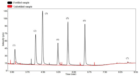 ![]() Figure 1. Chromatograms for the samples of unfortified effluent (matrix) and effluent fortified with the VFAs investigated in this study. Acids: (1) acetic, (2) propionic, (3) isobutyric, (4) butyric, (5) isovaleric, (6) valeric, and (7) octanoic (internal standard)