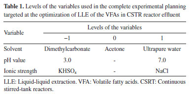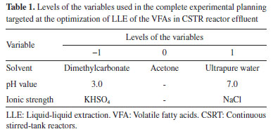 EXPERIMENTAL Chemical reagents and materials The experiments were conducted using the following analytical standards obtained from Sigma-Aldrich (Saint Louis, MO, USA): acetic acid, propionic acid, isobutyric acid, butyric acid, isovaleric acid, valeric acid and octanoic acid, with purity ≥ 99.0-99.5%. For the acidification of the samples, we employed 85% phosphoric acid (v/v) (Sigma-Aldrich, P.A.). The following salts were used in the experiments: potassium bisulfate (Merck, ≥ 99.0%) and sodium chloride (Dinâmica, P.A., 99.0%). The solvents used in the experiments included the following: acetone (Merck, HPLC grade ≥ 99.8%), dimetylcarbonate (Sigma-Aldrich, HPLC grade ≥ 99.0%) and ultrapure water with controlled resistivity of 18.2 MΩ cm (ELGA, Purelab Option Q). The ultrapure water was also used to wash the glassware and to prepare the solutions. For the chromatographic analyses, we employed the following gases: nitrogen 5.0 (Air liquid, purity of 99.999%), hydrogen 5.0 (Air liquid, purity of 99.999%) and synthetic air (Air liquid, purity of 99.999%). Effluents from reactors Samples of effluent from CSTR-type reactors were used in the development of the analytical method proposed in this study. The substrate for the feeding of the reactors was constituted by a mixture of ground organic restaurant waste, powdered cocoa, and corn bran. The reactors were operated in batches until the volumetric production of biogas was stabilized. Subsequently, the reactors were fed again with a mixture of substrate and inoculum in another cycle of acclimatization/temperature, which lasted 10 days. After this period, the reactors were operated in semicontinuous mode using a volumetric organic load (VOL) of 0.5 g of volatile solids (VS) L-1 day-1, which was later increased to 0.83 g VS L-1 day-1 from the 15th day of the experiment. The samples of effluent were collected three times a week during the operation period of the reactors, according to the collection and storage procedures described in VDI 4630.28 The study was conducted in three bench-top reactors, which were named R1, R2, and R3. The R1 reactor had a stainless steel operating tank containing 9.0 L of useful volume, while the reactors R2 and R3 were constructed using acrylic material with useful volume of 5 L each. Parameters for the optimization of liquid-liquid extraction (LLE) of VFAs The LLE technique was used for the extraction of the VFAs from aqueous media; the technique employed was adapted from the methodologies described by Banel et al.21 and Ghidotti et al.4 For the optimization of the procedure involving the extraction of VFAs, we employed a complete factorial planning with three variables: extracting solvent (3 levels), pH value (2 levels), and ionic strength (2 levels); these variables were tested directly in the matrix (Table 1).