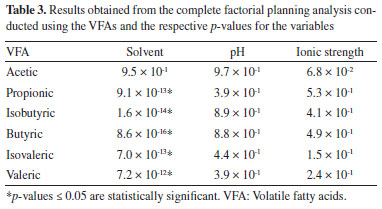 RESULTS AND DISCUSSION The liquid-liquid extraction (LLE) technique was used for the extraction of the analytes from the complex matrix of the samples to an organic phase which can be readily filtered. The procedures involving the cleaning up of the samples, for the removal of the solids, were executed initially before the LLE process (centrifugation) and after the process (filtering); this was done in order to reduce any interfering effects during the chromatographic analyses, as recommended by the official method for the determination of VFAs.12 To effectively determine the optimal extraction conditions, the VFAs were evaluated separately using the ANOVA test (Table 3).