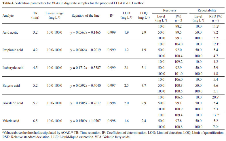 CONCLUSION In the present study, the LLE method was optimized and validated and GC-FID analysis was applied for the simultaneous determination of acetic acid, propionic acid, isobutyric acid, butyric acid, isovaleric acid and valeric acid in samples of effluents obtained from anaerobic digestion in CSTR-type bench-top reactors. Under the method proposed in this study, the samples were prepared by the LLE technique, where acetone was used as solvent and KHSO4 as ionic force modifier; the application of this technique promoted an effective, selective extraction of the analytes of interest. The LLE-based preparation technique is a simple, fast alternative method for the extraction of analytes. The extraction procedure, which is followed by the filtering of the extract, prevents impurities from being inserted directly into the chromatograph, and this enhances the durability of the chromatographic column and helps ensure the quality of the assays conducted. The application of the LLE-based method yielded satisfactory values with LOD ranging from 1.2 to 2.5 mg L-1, LOQ ranging from 1.9 to 3.7 mg L-1, recovery percentages between 90.9 and 104.0%, and repeatability ranging from 4.2 to 20.7%. The proposed method was found to be simple and straightforward, apart from consuming lower amount of solvents and being fast to perform. Thus, based on the results obtained here, one can conclude that the proposed method can be suitably applied for the conduct of routine assays involving the analysis of samples of effluents from different reactors targeted at the simultaneous determination of VFAs using GC-FID. The assays conducted in real samples allowed the successful identification and quantification of acetic acid and propionic acid in the reactors; these VFAs are considered the most predominant acids in the AD process. The least predominant acids were not identified. Isobutyric and isovaleric acids, which when present in concentrations higher than 5.0 mg L-1 may indicate an imbalance in the reaction medium, were also not identified. The LOD obtained for the VFAs ranged from 2.1 to 2.0 mg L-1, while the LOQ ranged between 3.1 and 2.9 mg L-1. Thus, based on the findings of this study, one can conclude that the proposed method is highly suitable for use in monitoring individual concentrations of VFAs which are considered essentially critical in AD. SUPPLEMENTARY MATERIAL Some images related to the results obtained in this work are available at http://quimicanova.sbq.org.br, in file PDF form, with free access.