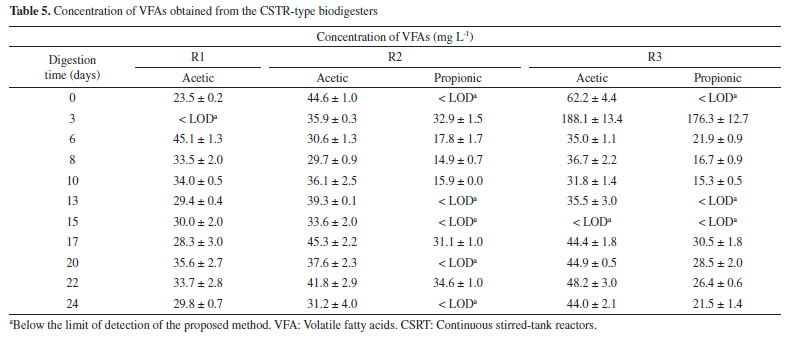 Looking at Table 5, one will observe that in the R1 samples, acetic acid was detected and quantified in the concentration ranges of 23.5 ± 0.2 and 45.1 ± 1.3 mg L-1. In the R2 biodigester, acetic acid was identified in the range of 29.7 ± 0.9-45.3 ± 2.2 mg L-1, and propionic acid from < LOD-34.6 ± 1.0 mg L-1. Similar patterns were observed in R3, where we noted the presence of acetic acid in concentrations ranging between < LOD and 188.1 ± 13.4 mg L-1 and propionic acid in concentrations ranging from < LOD to 176.3 ± 12.7 mg L-1. It should be noted that fatty acids considered to be in minority in the mesophilic range (butyric, isobutyric, valeric, and isovaleric acid) were neither identified nor quantified in the digesters (below the LOD of the proposed method). Another point that deserves mentioning here is that acetic acid is considered the main VFA produced in the biodigesters, and the presence of this acid is regarded as suitable at the concentration of up to 800.0 mg L-1.19 Studies reported in the literature20 investigated the accumulation of acetic acid during anaerobic digestion of food waste, and this acid was considered the VFA with the highest potential for inhibition when in excessive quantity - this resulted in a decrease in methane production. More recently, studies reported in the literature19 investigated the presence of propionic acid in two reactors; the results obtained showed the presence of concentrations of propionic acid in the range of 8.9 and 9.2 mg L-1. Despite the fact that the values obtained in our present study were superior to the values obtained in the aforementioned study - R2 (14.9 to 24.6 mg L-1), R3 (15.3 to 173.0 mg L-1), and no concentration of the acid was detected in R1 - the propionic/acetic acid ratio was below 1.4, as recommended in the literature. In another related study, 17 samples of AD reactors were evaluated, and the results obtained showed significant variations in the total amount of VFAs relative to the type of reactors. The reactors in the aforementioned study were divided into three types: primary reactors - which comprised the hydrolysis and acidogenesis phases; secondary reactors - which were responsible for the acetogenesis and methanogenesis phases; and single reactors. The total amount of VFAs obtained in the primary reactors varied between 137.0 and 3776.0 mg kg-1. In the secondary reactors, the total amount of VFAs obtained ranged from 53.0 to 346.0 mg kg-1. Regarding the single reactors, the digestate derived from the use of slaughterhouse residues as substrate exhibited a total amount of VFAs of 74.0 mg kg-1, while the other single reactors that employed samples of cattle waste exhibited a total amount of VFAs of 63.0 mg kg-1. These values are in line with the maximum concentrations of VFAs obtained in our present study: 45.0 and 76.4 mg L-1 in R1 and R2, respectively. The R3 reactor exhibited a maximum concentration of VFAs of 364.4 mg L-1 (quite similar to the amount obtained in the secondary reactors) in the third day of AD - this value is considered higher than the values obtained for other reactors and considerably different from the values obtained for the same reactor in the other days evaluated (R2). Despite the differences observed in the units employed in the methods, the results obtained can be compared once they are mostly related to aqueous samples. Another interesting work25 that is worth mentioning is the study that evaluated real samples from different sludges of wastewater based on the application of the official method (APHA)12 by GC-FID; the study obtained the concentration range of 0.8-1.89, 0.03-2.0, 0.03-1.98, and 0.11-0.25 g L-1 for acetic acid, propionic acid, butyric acid, and valeric acid, respectively. This study showed a large concentration range for the analytes in different samples derived from AD. Most of the samples evaluated in the aforementioned study recorded analytes concentrations above those found in our present study. Although low concentrations of VFAs were recorded in all the reactors, we noted a slight increase in VFAs concentrations in R2 and R3 when the reactors started operating at higher VOL (0.83 g VS L-1 day-1), after the 15th day of operation. We also observed the re-appearance of propionic acid in the reactors R2 and R3, following the increase in VOL; this points to the importance of determining the VFAs individually, as this primarily helps identify any possible imbalances in the reaction medium caused by the change in the operating conditions of the reactors.4,28 The total concentration of VFAs obtained in the three reactors was less than the values reported in the literature (between 1000 and 4000 mg L-1)5 due to the low VOL employed in the initial phase of the implementation of the bench-top reactors. It is worth noting that low VOL (between 0.5 and 0.83 g VS L-1 day-1) is recommended by VDI 463028 for the initial operating procedure of the reactor.