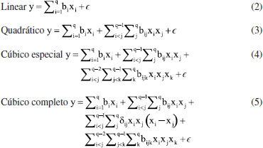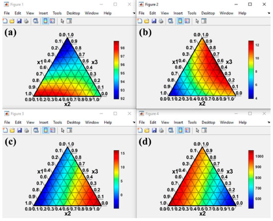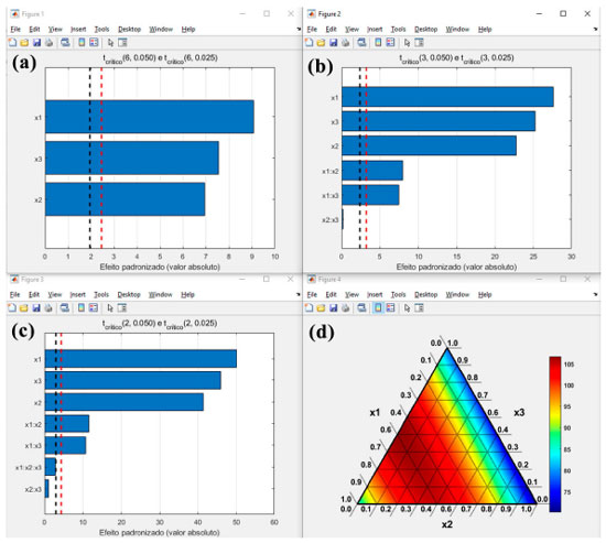 ![]() Figura 13. (a) Modelo linear. (b) Modelo quadrático. (c) Modelo cúbico especial. (d) Diagrama ternário para o planejamento de misturas simplex centroide