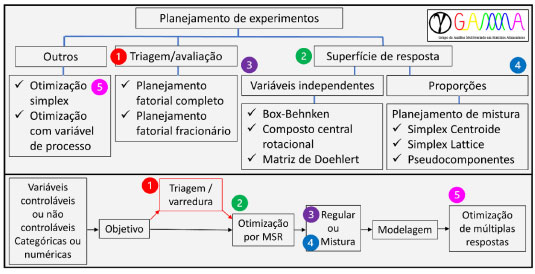 ![]() Figura 1. Possibilidades de aplicação do GAMMA-GUI usando a interface de planejamento e otimização de experimentos (superior). Esquema geral para implementação das técnicas de planejamento e otimização de experimentos (inferior) (nota: a etapa (1) é opcional, e depende do número de fatores investigados)