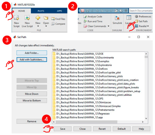INTERFACE GRÁFICA Esse tutorial tem como objetivo realizar demonstrações práticas utilizando a interface de planejamento de experimentos do aplicativo GAMMA-GUI. O aplicativo foi desenvolvido utilizando a interface gráfica do usuário (graphical user interface, GUI) e implementado usando programação orientada a objetos (object-oriented programming, OOP) do software Matlab®.11 Os códigos e algoritmos implementados no aplicativo contém funções nativas do próprio Matlab, scripts desenvolvidos pelos próprios autores ou adaptações de scripts disponíveis gratuitamente para download (créditos devidamente reconhecidos aos desenvolvedores). O aplicativo foi testado nas versões do software Matlab R2022b, R2023a e R2023b. A execução de todas as funcionalidades do aplicativo requer funções dos toolbox "Global Optimization Toolbox", "Optimization Toolbox", "Statistics and Machine Learning Toolbox" e "Signal Processing Toolbox", entretanto, a interface de planejamento de experimentos requer somente o toolbox "Statistics and Machine Learning Toolbox". O aplicativo GAMMA-GUI e os conjuntos de dados para demonstração usados neste tutorial podem ser visualizados no canal do YouTube https://www.youtube.com/@appGAMMA, na página do Instagram https://www.instagram.com/appgamma_gui/ e o aplicativo está disponível gratuitamente para download no GitHub https://github.com/appGAMMA. Esse pacote é livremente distribuído, os autores não se responsabilizam pelos resultados obtidos através da livre utilização dessas rotinas, sua comercialização e modificação não está autorizada. Instalando e executando o GAMMA-GUI Após o download do aplicativo os usuários terão um arquivo no formato GAMMA.zip. Descompacte o arquivo no local que se deseja realizar a instalação, após isso abra o software Matlab e selecione "Home" e então "Set Path". Uma nova janela se abrirá, selecione "Add with Subfolders", selecione o diretório onde foi descompactado os arquivos, selecionar pasta com os arquivos, "Save" e "Close". Veja o esquema de instalação na Figura 2, ou tutorial de instalação no YouTube https://www.youtube.com/watch?v=c5uRUFJ14Jk.