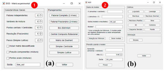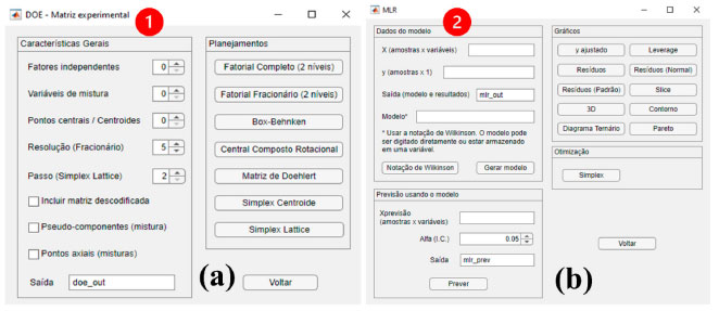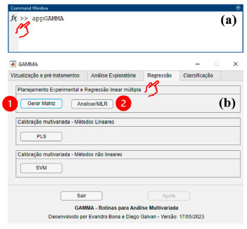 ![]() Figura 3. (a) Iniciando o aplicativo na janela "Command Window". (b) Interface inicial do aplicativo GAMMA-GUI. Selecione a janela de "Regressão" que corresponde a interface de planejamento de experimentos