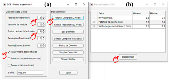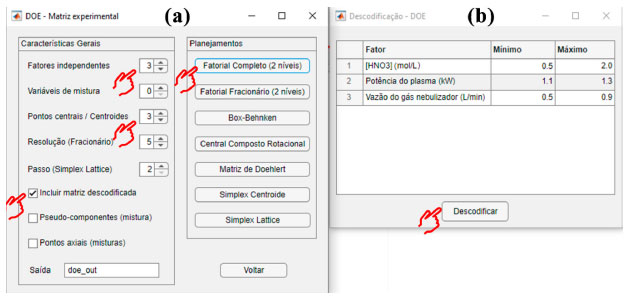![]() Figura 5. (a) Escolhendo e gerando a matriz do planejamento experimental. (b) Incluindo os valores descodificados na matriz de dados