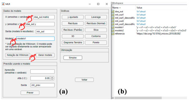 Após gerar a matriz de planejamento, a próxima etapa consiste em realizar os experimentos para cada condição pré-definida de modo aleatório para evitar erros sistemáticos. Uma etapa crucial do processo, é a criação do vetor y (variável dependente), que contém os valores obtidos experimentalmente. Os valores de yi devem corresponder ao devido experimento de que se trata. Após essa "cautela", com os dados em mãos, é hora de analisar os resultados utilizando a interface "Analisar/MLR". Ao apertar o botão "Analisar/MLR" a interface "MLR" se abrirá, e nela os usuários devem inserir na caixa "Dados modelos" a matriz de dados X (variáveis independentes) e o vetor y (variável dependente) a serem analisados, que nesse caso foi o sinal de emissão do urânio medido em 367,007 nm. Optamos nesse exemplo por criar um vetor y dentro da própria estrutura "doe_out" usando o comando CTRL + N, renomeando o novo vetor como "y", e então os respectivos valores experimentais (planilha: Planejamento_fatorial.xlsx disponibilizada nos conjuntos de dados usados como demonstração) devem ser inseridos neste vetor. Agora os nomes da matriz de dados X do planejamento e o vetor y devem ser digitados nos campos "X (amostras × variáveis)" e "vetor y (amostras × 1)", respectivamente. Aqui, optamos por "pegar" os valores de X e y dentro da própria estrutura "doe_out" gerada anteriormente, para isso, utilizamos as seguintes notações "doe_out.matriz" e "doe_out.y". Cabe ainda ressaltar que, os usuários têm a possibilidade de utilizar a matriz de dados descodificados. Mas por razões matemáticas e estatísticas, é recomendável que a análise dos dados seja realizada com a matriz de dados codificados, enquanto, as representações gráficas ficam a critério dos usuários utilizar os valores codificados ou não. Na opção "Modelo", os usuários podem construir diversas possibilidades de modelos usando a notação de Wilkinson. No botão "Notação de Wilkinson", os usuários têm alguns exemplos de sua utilização. Mais detalhes podem ainda ser encontrados no "help" do Matlab e no site https://www.mathworks.com/help/stats/wilkinson-notation.html. Nessa demonstração, optamos por avaliar dois modelos "modelo1" e "modelo2", que foram previamente escritos usando a notação de Wilkinson e salvos como "Modelos_fatorial_completo.mat". Ao abrir esse arquivo, automaticamente os modelos serão carregados para o Workspace do Matlab. Ao definir todas as opções, haverá em tela uma imagem semelhante a Figura 6, então o usuário deverá clicar em "Gerar modelo".
