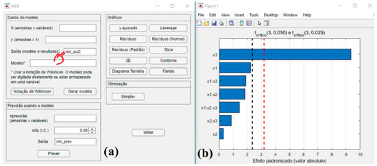O modelo gerado terá como default uma estrutura de saída chamada "mlr_out". Nessa estrutura de dados armazenada no Workspace, os usuários têm acesso a ANOVA (análise de variância), R2 (coeficiente de determinação), MSE (erro quadrático médio), RMSE (raiz quadrada do erro quadrático médio), coeficientes estimados, resíduos, entre outras métricas para avaliação da qualidade e ajuste do modelo com um único clique. Para mais detalhes sobre as métricas e suas interpretações os leitores podem consultar o trabalho de Breitkreitz et al.6 Conforme antecipado, nessa demonstração avaliamos a qualidade de ajuste de dois modelos lineares, um com efeitos de interação de primeira e segunda ordem "modelo1" e outro com efeitos de interação de primeira, segunda e terceira ordem "modelo2". Para isso, antes da avaliação de cada modelo as saídas foram renomeadas para "mlr_out1" ou "mlr_out2", que correspondem aos modelos 1 e 2, respectivamente (ver Figura 6b). Uma etapa importante ao utilizar um planejamento experimental é a avaliação da adequação do modelo construído das respostas obtidas experimentalmente, que ditará sua capacidade de previsão.6 Ao comparar o ajuste do modelo 1 e 2 pela ANOVA, nota-se que ambos os modelos foram significativos (p < 0,05) e não tiveram falta de ajuste (p > 0,05). Além disso, os valores de R2 (> 87,9% e 90,5%) e RMSE (44,7 e 39,6) para os modelos foram próximos. Nesses casos, os usuários podem checar a significância dos efeitos na tabela "ANOVA.efeitos" ou gráfico de Pareto apertando no botão "Pareto" usando a estrutura de dados "mlr_out2", que representa o modelo 2. Essa etapa permite checar se a inclusão do efeito de terceira ordem "x1:x2:x3" é significativa ou não em nível de 5%. Nesse caso, a inclusão do efeito de interação de terceira ordem não foi significativa (p = 0,24), portanto, seguimos o princípio do "bom senso" e "simplicidade" e optamos por utilizar o modelo 1 (ver Figura 7).