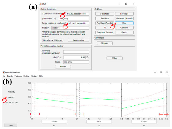 Ao definir o modelo mais adequado para o conjunto de dados experimentais, os usuários podem verificar os resultados visualmente usando as opções gráficas disponíveis. Nessas opções os usuários podem verificar a qualidade de ajuste do modelo na opção "y ajustado", ou ainda verificar a alavancagem dos pontos experimentais em "Leverage", entre outras opções de resíduos "Resíduos", "Resíduos (Normal)" ou "Resíduo (Padrão)". Uma interessante e interativa interface gráfica do GAMMA-GUI é a opção "Slice". Nessa opção, os usuários podem prever os valores de y estimados pelo modelo nos diferentes níveis experimentais dos fatores avaliados (Figura 8). Para uma melhor visualização, optamos por usar os valores x1, x2 e x3 descodificados nesse gráfico, portanto, um novo modelo com a matriz de dados descodificados precisa ser gerada, ou seja, os campos "X (amostras × variáveis)" e "Modelo*" devem ser renomeados para "doe_out.descodificado" e "mlr_out_descodific", respectivamente (Figura 8a). Na área de cada sub-gráfico há uma linha vertical pontilhada que pode ser direcionada conforme as necessidades do usuário. Essas linhas de x1, x2 ou x3 podem ser direcionadas para esquerda ou direita e o valor de y predito pelo modelo pode ser verificado (Figura 8b). Neste caso, optamos pelo aumento de y, ou seja, a maximização do sinal de emissão do urânio em 367,007 nm. Para essa resposta a condição de máximo é alcançada quando se utiliza 0,5 mol L-1 de HNO3, uma potência do plasma de 1,1 kW e vazão do gás do nebulizador de 0,9 L min-1 com um y de 585,9 U.