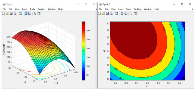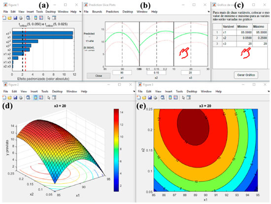![]() Figura 9. (a) Gráfico de Pareto. (b) Gráfico de slice. (c) Interface para fixação das variáveis. (d) Gráfico 3D. (e) Superfície de contorno