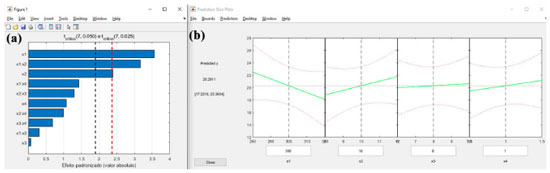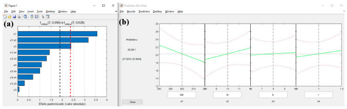 ![]() Figura 11. (a) Gráfico de Pareto do planejamento fatorial completo 24. (b) Gráfico de slice indicando os níveis dos fatores a serem otimizados