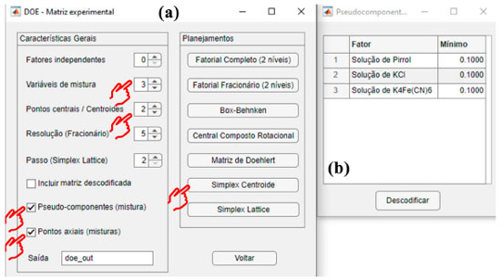 Após eleger o modelo adequado e verificar a qualidade de ajuste, os usuários podem gerar o diagrama de mistura apertando o botão "Diagrama Ternário" (Figura 13d), e então obter as proporções otimizadas na opção "Simplex" inserido "mlr_out2" na aba "Otimização Simplex" que se abrirá. Na interface "função de otimização", os usuários não podem esquecer de inserir o número de variáveis de misturas na caixa "Variáveis de misturas", três para esse caso e então apertar o botão "Otimizar". Na estrutura de dados "otm_out2" gerada no Workspace que corresponde aos valores otimizados para o modelo quadrático a condição otimizada foi de 66,6% TBHQ e 16,7% de BHT e BHA, que corresponde a um valor y de 104,6 kJ mol-1. Pseudocomponentes Em muitos casos de modelagem de misturas necessitamos da presença de todos os componentes para obter um produto apropriado. Nessa demonstração, temos a formulação de uma membrana de revestimento para um eletrodo seletivo com o objetivo de maximizar o sinal analítico (y) de substratos biológicos (link YouTube: https://www.youtube.com/watch?v=Rd9vOI0ZGdo). A formulação desta membrana só é possível se as soluções de pirrol (x1), KCl (x2) e K4[Fe(CN)6] (x3) estiverem todas presentes na mistura. Esse é um caso de planejamento de misturas com pseudocomponentes, isto é, variáveis "fictícias" são criadas para representar as proporções dos componentes reais da mistura. Nesse delineamento os limites inferiores dos componentes nas misturas foram definidos em 10%, que simultaneamente restringe o limite superior para 80%. Para mais detalhes consultar o trabalho de Barros Neto et al.5 Iniciaremos gerando a matriz de experimentos na interface "Gerar Matriz". O planejamento de mistura empregado nesse estudo foi o simplex aumentado, que contém ponto adicionais entre o ponto central e os vértices. O usuário deverá ajustar para três variáveis de misturas a opção "Variáveis de mistura" e incluir dois pontos centrais em "Centroides". Além disso, as opções "Pontos axiais (mistura)" e "Pseudo-componentes (misturas)" devem ser marcadas, e por fim apertar o botão "Simplex Centroide" (Figura 14a). Uma nova interface "Pseudocomponentes - DOE" se abrirá, e nesta janela os valores mínimos de cada componente devem ser definidos, que nesse caso foi 10% para cada, que corresponde a proporção de 0,1 (Figura 14b). Em seguida, aperte o botão "Descodificar" gerando a estrutura de dados "doe_out", que contêm as informações das restrições aplicadas, a matriz de experimentos codificada/pseudocomponentes e descodificada/real. Esse planejamento é composto por onze experimentos, dos quais dois são repetições no ponto central e três pontos axiais. Entretanto, alguns experimentos foram realizados em duplicata e outros em triplicata, totalizando vinte experimentos presentes na estrutura "doe_out_replicatas" que pode ser carregada em "Pseudocomponente_eletrodo_livro.mat" disponível no material de demonstração.