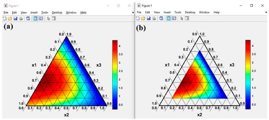 ![]() Figura 15. (a) Diagrama de misturas em pseudocomponentes e (b) região de domínio experimental avaliado