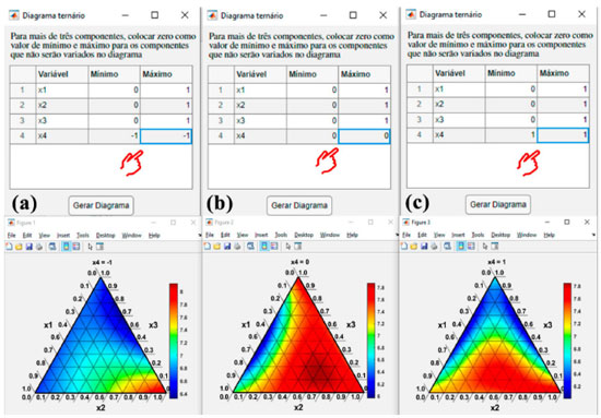 ![]() Figura 16. Diagrama de mistura em termos de pseudocomponentes fixando a variável de processo x4 em (a) 120 mL (-1), (b) 150 mL (0) e (c) 180 mL (+1)