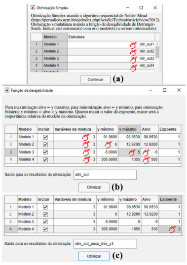 Para iniciar o processo de otimização o usuário deverá apertar o botão "Simplex", então a janela "Otimização Simplex" se abrirá. Nessa janela, o nome de cada estrutura "mlr_out1", "mlr_out2", "mlr_out3" e "mlr_out4" deve ser digitado em uma caixa, isto é, modelo 1, 2, 3 e 4, respectivamente, e então "Continuar", ver Figura 18a. Após, outra janela "função de desejabilidade" se abrirá, nessa janela os usuários têm a possibilidade de definir uma condição de máximo, mínimo ou de alvo, como também atribuir diferentes pesos a cada resposta. Neste caso, desejamos maximizar o rendimento (y1) e o período de indução (y2), entretanto, a ANP na ocasião requiria um valor mínimo de 6 h, portanto, o valor mínimo para y2 foi ajustado para 6. Em contrapartida, o ponto de entupimento a frio (y3) e o custo de matéria prima por tonelada (y4) devem ser minimizados. Na ocasião o valor máximo de ponto de entupimento considerado pela ANP era de 5 ºC, portanto, o valor máximo de y3 foi ajustado para 5, ver detalhes na Figura 18b. Para finalizar essa etapa, antes de apertar o botão "Otimizar", os valores de "Variáveis de mistura" devem ser ajustados para três, que correspondem aos três tipos de matéria-prima avaliadas. Nota importante, a opção "Variáveis de mistura" só será usada para casos de planejamento de misturas.