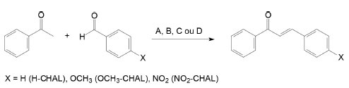 ![]() Figura 4. Reação geral utilizada para a preparação das chalconas. Metodologia A: tradicional refluxo térmico; metodologia B: maceração com BaO; metodologia C: maceração como Al2O3; metodologia D: irradiação por micro-ondas