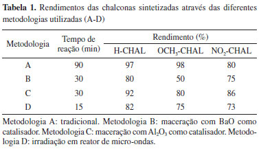 Na metodologia tradicional3 (metodologia A) a reação ocorreu através da condensação de Claisen-Schmidt em meio básico, utilizando etanol como solvente a temperatura ambiente. Utilizando se essa metodologia obtiveram-se os produtos desejados com rendimentos satisfatórios, como pode ser visto na Tabela 1, após 90 min de reação, sendo necessário deixar a solução em geladeira por 24 h, após a neutralização do meio da reação, para melhor precipitação do produto. Importante ressaltar que nessa metodologia não existe a necessidade de nenhum procedimento prévio, portanto sugere-se que essa seja a primeira de 3 aulas experimentais.