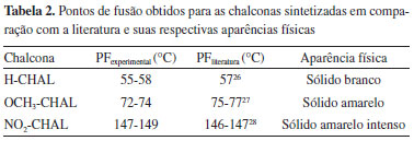 Na aula experimental seguinte podem ser realizadas as reações via mecanoquímica (maceração), correspondendo às metodologias B e C. Nessas reações foram utilizados dois suportes distintos (óxido de bário e alumina) e os processos ocorreram na ausência de solvente orgânico, sendo realizadas em 30 min. Importante destacar, que nessas metodologias tanto o óxido de bário quanto o óxido de alumínio precisaram ser previamente secos em estufa de aquecimento, por um período de 2 h, com o intuito de ativá-los e dessa forma auxiliar na evolução da reação, portanto essa parte deverá ser realizada anteriormente, ou seja, os alunos deverão ter acesso aos suportes já ativados. Na metodologia B foi possível a obtenção dos produtos de interesse de forma satisfatória e com bons rendimentos, na faixa de 50-80%. Já ao utilizar a alumina (metodologia C) obtiveram-se os melhores resultados, com a formação dos produtos desejados em altos rendimentos, na faixa de 80-92% (ver Tabela 1). É importante destacar que o uso da alumina como suporte foi baseado na literatura com modificações, pois os autores utilizam metanol como solvente e o óxido de alumínio ligado ao fluoreto de potássio (KF-Al2O3) como catalisador, além de KOH, e irradiação em banho de ultrassom.25 Essas metodologias devem ser trabalhadas juntas, na mesma aula, como a duração da reação é de 30 min os alunos podem ser agrupados, onde cada grupo realizaria uma das metodologias e, depois realiza se a comparação de resultados. Frente a metodologia A essas duas apresentam as vantagens de possuírem um menor tempo de reação, com uma redução de 60 min, e a não necessidade da utilização de solvente orgânico para sua realização, e nem a utilização de energia elétrica, sendo utilizada a força física para poder promover a interação entre os reagentes. Outro ponto importante é que a pessoa que está macerando consegue observar visualmente a mudança no sistema reacional, observando a formação de precipitado ou a mudança de coloração (dependendo do substituinte a coloração muda) e vendo a reação acontecer, diferentemente da metodologia A. Porém, um ponto importante para ressaltar com os alunos é a diferença dos suportes usados, deve-se informar que os compostos de bário são menos desejáveis que os de alumínio, devido a maior toxicidade dos primeiros. Outro fator importante é que como essa reação não faz uso de solvente orgânico ela está mais adequada aos princípios da Química Verde do que a primeira metodologia, ou seja, já é gerado menos resíduo que a anterior. Para separação dos produtos dos suportes, adicionou-se água gelada para sua solubilização. Utilizando-se a quarta e última metodologia (D), sugere-se que seja realizada em uma terceira aula. A reação foi realizada em etanol como solvente e com adição de gotas da solução de NaOH (10%), assim como na metodologia A, essa também faz uso de solvente e de uma fonte de energia, nesse caso, a irradiação por micro-ondas em reator científico. O tempo de reação foi de 15 min, o menor tempo dentre as metodologias estudadas e os rendimentos foram na faixa de 73-80% (Tabela 1). Apesar de apresentar o menor tempo, essa metodologia fez utilização de solvente, consistindo em ponto desfavorável frente as metodologias B e C, mas tem a vantagem frente a metodologia tradicional pois o tempo de reação foi bem menor. Uma das formas possíveis de caracterização da formação do produto de interesse é a determinação do ponto de fusão (PF), como se trata de substâncias já conhecidas, comentado anteriormente, essa foi uma forma mais prática de realizar a identificação, além de ser um método acessível dentro dos laboratórios de aulas experimentais. Sugere-se que os alunos pesquisem previamente na literatura o valor do PF de cada uma das substâncias para comparação com os obtidos na prática. A Tabela 2 mostra os pontos de fusão e a aparência das chalconas sintetizadas.