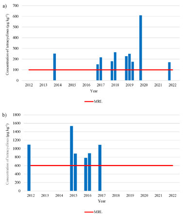 ![]() Figure 1. (a) Non-compliant results (concentration of tetracycline residues) in swine muscle in the last 11 years. (b) Non-compliant results (concentration of tetracycline residues) over the last 11 years in swine kidney. Each column represents one sample. Total swine muscle samples analyzed in PNCRC by year: 35 (2012), 48 (2013), 239 (2014), 531 (2015), 602 (2016), 604 (2017), 601 (2018), 609 (2019), 620 (2020), 597 (2021) and 596 (2022). Total swine kidney samples analyzed in PNCRC by year: 528 (2012), 511 (2013), 523 (2014), 521 (2015), 603 (2016), 604 (2017), 587 (2018), 0 (2019), 0 (2020), 0 (2021) and 0 (2022)