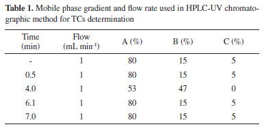 EXPERIMENTAL Chemicals The analytical standards tetracycline hydrochloride, chlortetracycline hydrochloride, oxytetracycline hydrochloride and doxycycline hydrochloride were all purchased from Sigma-Aldrich (St. Louis, USA) with a quality level of 100 (QL 100). All solvents were HPLC grade and acquired from Panreac (Darmstadt, Germany) and J.T. Baker (USA). Purification system provided by Millipore (Advantage A10) was used to obtain ultrapure water. Dichloromethane (P.A.) and petroleum ether (P.A.) were purchased from Êxodo Científica (Sumaré, SP, Brazil), and hydrochloric acid (36.5-38.0% purity) from Panreac (Spain). The filter used was Millex® (Millipore), 33 mm, 0.45 µm. Sampling Twenty-five swine muscle samples received from 7 Brazilian states (Santa Catarina, Rio Grande do Sul, Paraná, Mato Grosso, Minas Gerais, Goiânia and São Paulo) were assessed in order to contribute to the PNCRC of MAPA in 2012. The collected samples were frozen (-20 ºC) and then sent in thermal boxes to Microbiotic Laboratory Analysis (accredited by MAPA). Once in the laboratory, samples were analyzed within 24 h. Sample preparation The procedures followed the methods described in MAPA protocols designated for residue determination.13 A 3.0 ± 0.1 g sample of properly homogenized swine meat was weighed at room temperature in 50 mL Falcon tubes. To evaluate the control sample (with no residue of the analyte under study), 10 portions of 3.0 ± 0.1 g of homogenized sample were weighed into 50 mL Falcon tubes: 1 for blank, 3 for quality controls (QCs) and 6 for the matrix-matched calibration curve. In all samples, including the curve, QCs and blank, 100 µL of HCl (1 mol L-1) was added, and five blank samples were fortified with the standard solution containing 1000 µg L-1 of each tetracycline for preparing a matrix-matched calibration curve (concentration ranging from 25 to 200 µg kg-1). The unfortified blank sample was used as a control. QCs tubes were also fortified at the MRL value of the analyte (200 µg kg-1 for oxytetracycline, tetracycline and chlortetracycline and 100 µg kg-1 for doxycycline). Control and fortified samples were treated as follows: 5 mL of acetonitrile were added, stirred for 1 min, and centrifuged for 10 min at 3000 rpm at 15 ± 2 °C. Next, the supernatant was transferred to another 50 mL Falcon tube and the lower phase discarded. Subsequently, 10 mL petroleum ether and 5 mL dichloromethane were added to the tube with the supernatant, which was then shaken manually for 30 s and centrifuged (5 min, 3000 rpm) at 15 ± 2 °C. The lower (aqueous) phase was transferred to a 15 mL Falcon tube. To the tube with the upper phase, 0.5 mL ultrapure water was added, shaken manually for 30 s, and centrifuged for 5 min at 3000 rpm, 15 ± 2 °C. The lower (aqueous) phase was transferred to the same tube as the previous extraction and the upper phase was discarded. The tubes were vortexed for 15 s and centrifuged for about 5 min at 3000 rpm at 15 ± 2 °C. The upper organic phase was discarded. The remaining organic solvent (dichloromethane and petroleum ether) was evaporated under nitrogen for 20 min at room temperature. The volume of the tube was made up to 2 mL with ultrapure water, passed through the 0.45 µm PTFE filter and injected into the liquid chromatograph. High-performance liquid chromatography coupled to an ultraviolet detector (HPLC-UV) High-performance liquid chromatography (HPLC) coupled to an ultraviolet (UV) detector was used to determine the residues of the different TCs. A C18 4.6 mm × 150 mm (3.5 µm) column was used to separate the compounds. As mobile phase, 0.01 mol L-1 oxalic acid (A), acetonitrile (B) and methanol (C) were used in gradient mode. The injected volume was 100 µL at wavelength λ = 365 nm. Table 1 shows the gradient of the mobile phase.