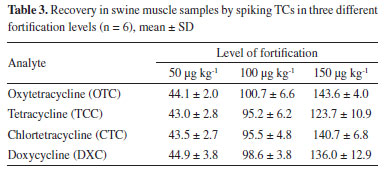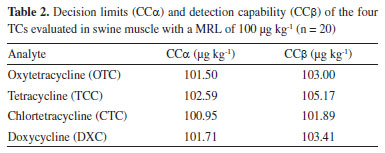 RESULTS AND DISCUSSIONS The PNCRC for TCs in swine comprise analysis in muscle and kidney samples, which are the same selected matrices established by Codex legislation. These target matrices are monitored due to the fact that TCs are well absorbed from the gastrointestinal tract, are widely distributed in the body with highest levels in the kidneys and liver, undergo minimal or no metabolism, and are excreted in urine and feces. Muscle and kidney are complex matrices and usually require an appropriate sample preparation and a robust and sensitive analytical method for determination. To new or modified methodologies, its validation is necessary as it ensures the reliability of the results. Table 2 shows the decision limits (CCα) and detection capability (CCβ) of the different TCs determined in swine muscle samples. The results are in accordance to those reported by Tölgyesi et al.14 for the same evaluated concentration.
