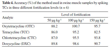 The methodology used for the evaluation of TCs showed calibration curves with determination coefficients r2 > 0.99 for all analytes, therefore with satisfactory linearity. Method recovery was also evaluated at the following concentrations: 0.5 MRL (50 µg k g -1), 1.0 MRL (100 µg kg-1) and 1.5 MLR (150 µg kg-1) respectively for each tetracycline in six replicates (Table 3) and the calculated accuracy (Table 4).