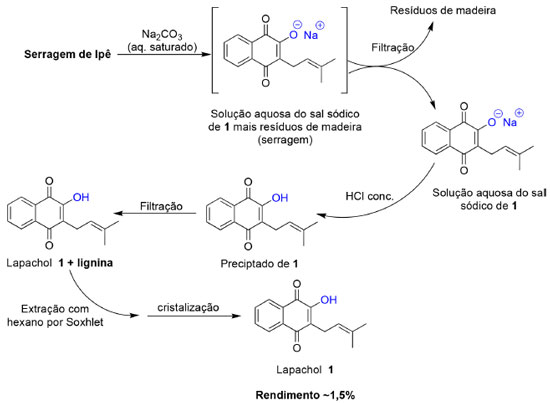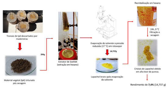 O objetivo deste estudo foi investigar uma nova estratégia aprimorada para a obtenção do lapachol (1) a partir da serragem do ipê, visando reduzir o número de etapas e aumentar o rendimento do isolamento do produto natural. Para alcançar esse objetivo, foi desenvolvido um processo de isolamento do lapachol (1) diretamente da matriz vegetal do ipê utilizando um extrator de Soxhlet e hexano como solvente. Essa abordagem elimina a necessidade das etapas de extração ácido-base e várias filtrações, simplificando o processo de obtenção do lapachol (1) de forma mais eficiente.