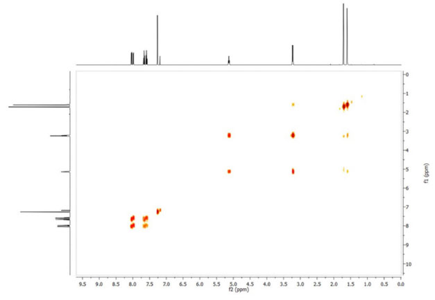 ![]() Figura 3. Espectro 2D 1H-1H-COSY para o lapachol (1) em CDCl3, a 500 MHz