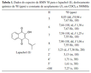PARTE EXPERIMENTAL O solvente hexano (mistura de isômeros) foi adquirido da BioScie Indústria (Anápolis, GO, Brasil) e foi usado sem purificação adicional. A extração foi realizada em extrator de Soxhlet (RL New, Rio de Janeiro, RJ, Brasil) e as destilações a pressão reduzida em rotaevaporador IKA modelo RV-10 Basic (Campinas, SP, Brasil). Os pontos de fusão foram obtidos em aparelho Thermo Scientific 9100 (Waltham, EUA) e não foram corrigidos. Os espectros de RMN de 1H (1D e 2D) foram registrados à temperatura ambiente usando espectrômetro Bruker Advanced NEO 500 MHz (Fällanden, Suíca), em CDCl3. Os deslocamentos químicos foram relatados em unidades de δ (ppm) e o solvente foi usado como padrão interno; e as constantes de acoplamento (J) são relatadas em Hertz e referem-se a multiplicidades de pico aparentes. Um cartucho de celulose contendo 200 g de serragem de ipê foi depositado em um extrator de Soxhlet equipado com um balão de 2 L contendo 800 mL de hexano. Após dois ciclos de extração, o solvente foi evaporado e os cristais obtidos foram recristalizados a frio em hexano, em freezer por 24 h. O lapachol (1) foi filtrado e obtido na forma de cristais dourados em 7,4% de rendimento em massa (14,7 g, ponto de fusão: 139-140 ºC, ponto de fusão literatura: 139-140 ºC). 2-Hidroxi-3-(3-metilbut-2-en-1-il)naftalen-1,4-diona (1) Cristais amarelos; rendimento em massa de 7,4% (14,7 g); pf 139-140 ºC; 1H RMN (500,00 MHz, CDCl3) δ 8,03 (dd, J 0,94 e 7,67 Hz, 1H), 7,66 (1H, td, J 1,38 e 7,67 Hz, 1H), 7,58 (1H, td, J 1,25 e 7,55 Hz, 1H), 7,98 (1H, dd, J 1,06 e 7,55 Hz, 1H), 3,23 (d, J 7,38 Hz, 2H), 5,13 (m, 1H), 1,71 (s, 3H), 1,61 (s, 3H), 7,27 (s, 1H).