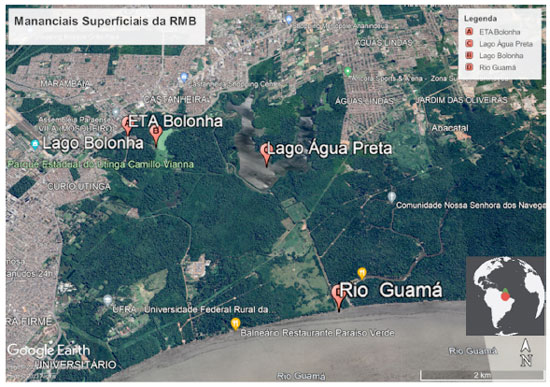 O objeto deste estudo são os mananciais superficiais que constituem a entrada de água bruta da estação de tratamento de água (ETA Bolonha), da Companhia de Saneamento do Pará (COSANPA), localizado no município de Belém (Pará, Brasil). Estes mananciais compreendem o Rio Guamá, o Lago Água Preta e Lago Bolonha. O estudo também considerou a saída da estação de tratamento de água.