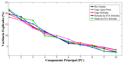A análise de componentes principais (PCA) realizada na matriz de dados de qualidade do Rio Guamá envolveu 87 amostras e 12 variáveis. Adotando-se o critério de Kaiser,29 a PCA apresentou cinco componentes principais mais importantes, totalizando 72,98% da variância total dos dados.