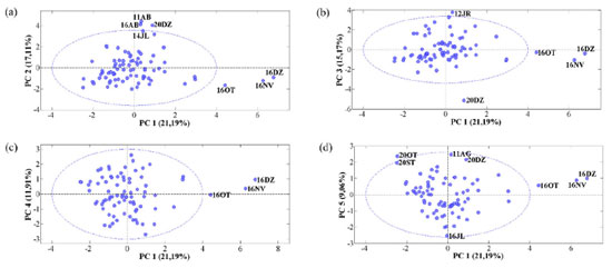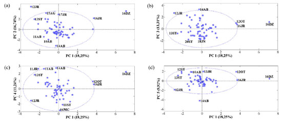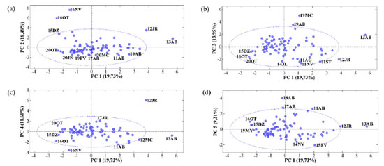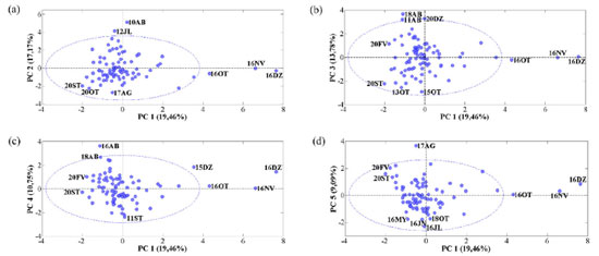 Figura 6. Gráfico de escores da entrada da ETA Bolonha: (a) PC 1 vs. PC 2; (b) PC 1 vs. PC 3; (c) PC 1 vs. PC 4 e (d) PC 1 vs. PC 5