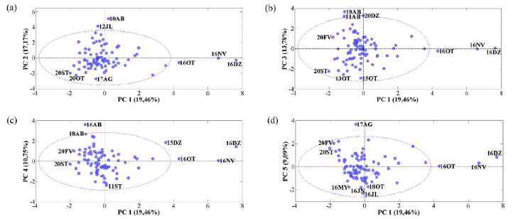 Figura 5. Gráfico de escores do Lago Bolonha: (a) PC 1 vs. PC 2; (b) PC 1 vs. PC 3; (c) PC 1 vs. PC 4 e (d) PC 1 vs. PC 5