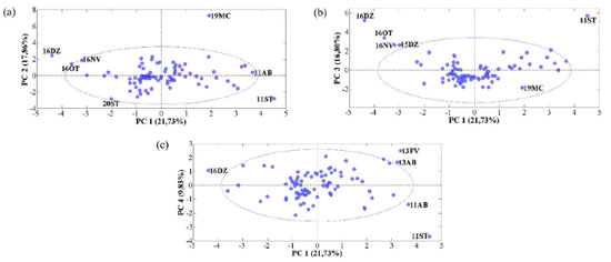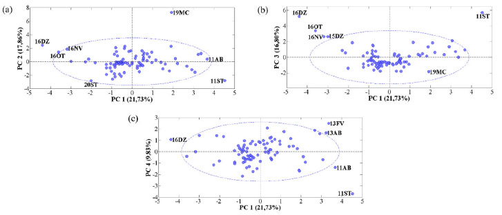 Figura 7. Gráfico de escores da saída da ETA Bolonha: (a) PC 1 vs. PC 2; (b) PC 1 vs. PC 3 e (c) PC 1 vs. PC 4