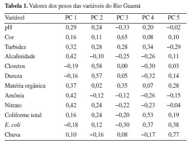 Resultados semelhantes foram obtidos por Gutierrez et al.,25 que na PCA do Lago Bolonha, associaram os maiores pesos em dureza total e cloretos para a PC 1 e pH para a PC 2, dentre outras.