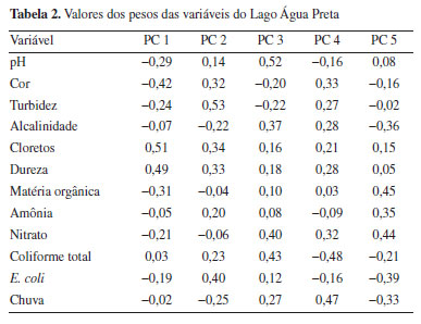 A Tabela 2 apresenta os valores dos pesos das variáveis em cada componente principal do Lago Água Preta.